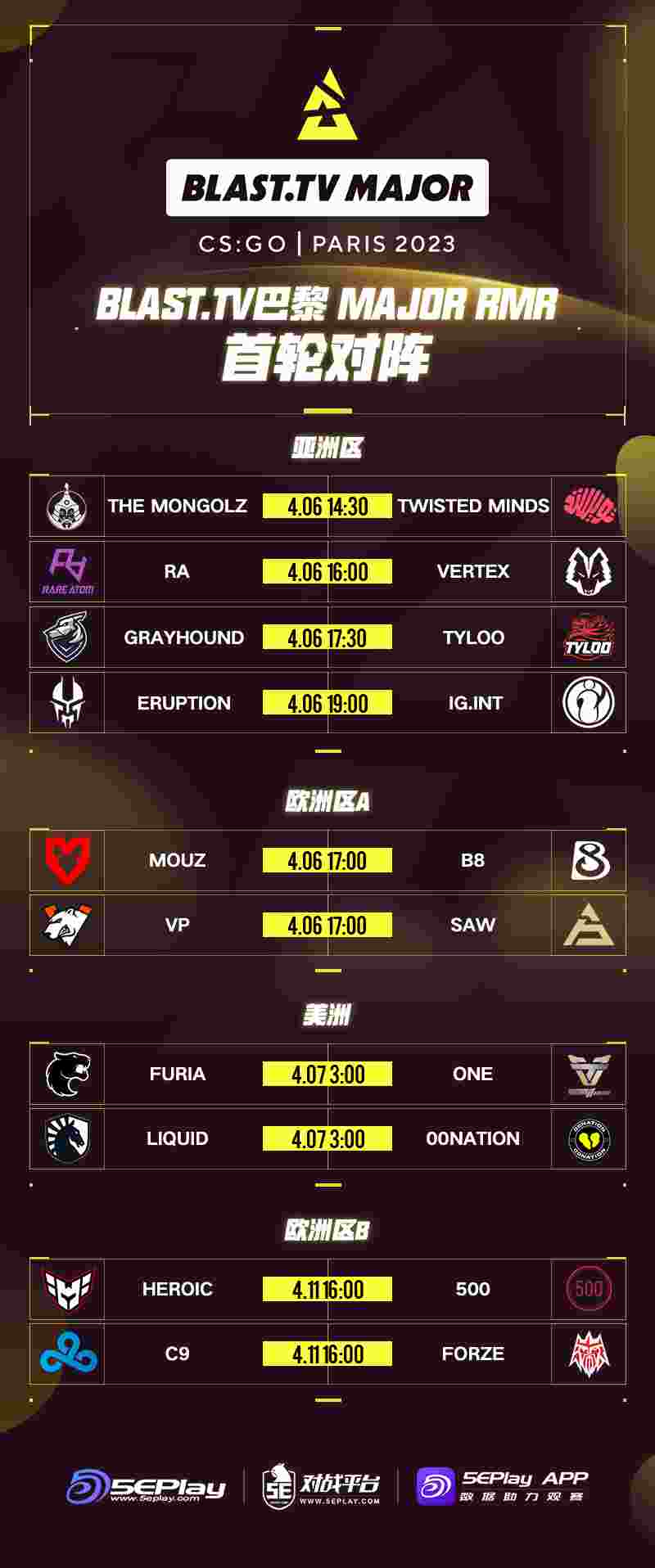 本次RMR的揭幕战由蒙古之师THE MONGOLZ对阵Twisted Minds于4月6日下午两点半开战,中国战队RA将在四点迎战VERTEX,TYLOO将在17.30对阵澳洲战队GRAYHOUND!MOUZ对阵B8、VP对阵SAW将在同日晚五点进行,美洲区的对局将会在4月7日打响。