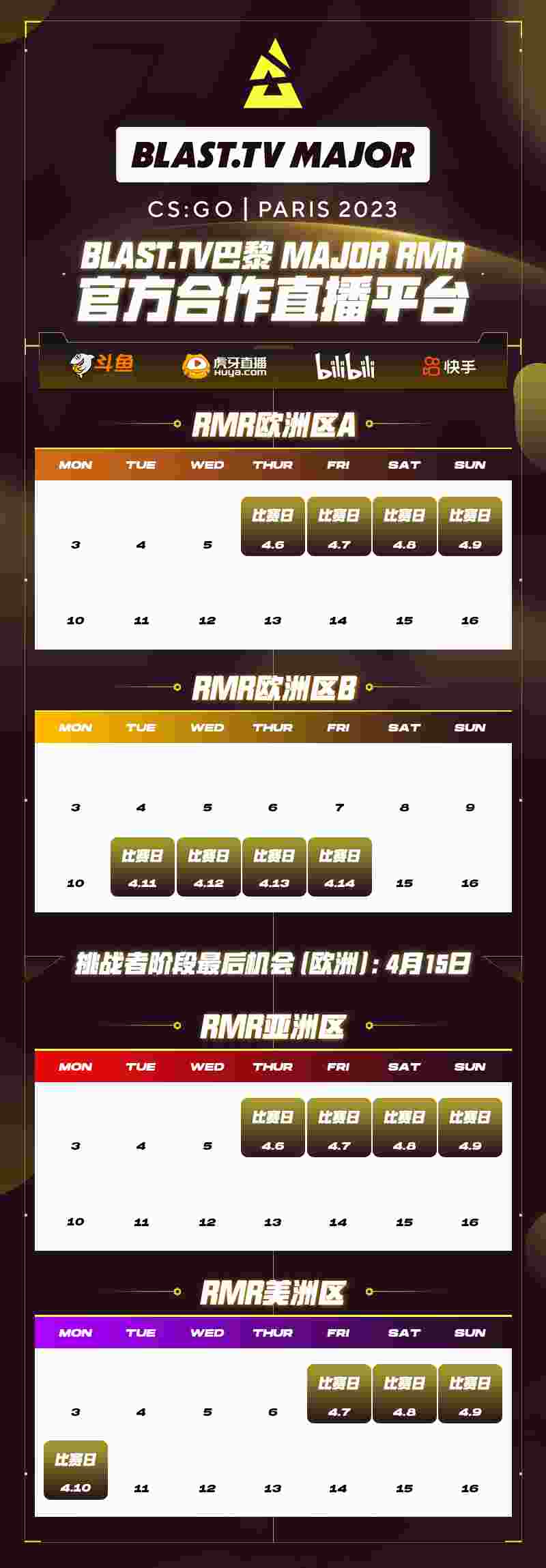 RMR亚洲区与欧洲区 A将在4月6日全面开打;4月7日RMR美洲区上线;4月11日RMR欧洲区 B正式开赛。欧洲挑战者阶段最后机会将在4月15日一日内决出胜者。4月6日至4月15日,精彩不断好戏连连!