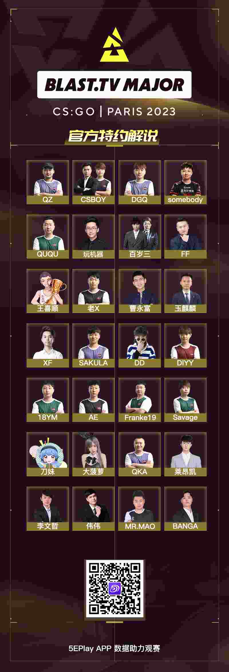 5EPlay合作主播将共襄盛举,为粉丝们提供最好的观赛体验。5EPlay邀请大家熟悉的QZ、CSBOY、SOMEBODY、QUQU和冬瓜强等主播作为BLAST.tv巴黎 Major RMR的特约解说参与赛事的全程解说,他们会在各自的直播间内通过专业与趣味兼具的视角,为大家带来精彩的赛事点评。同时5EPlay APP也将继续为主播与玩家提供最及时的赛事数据,帮助玩家更真切感受BLAST.tv巴黎 Major RMR的魅力。