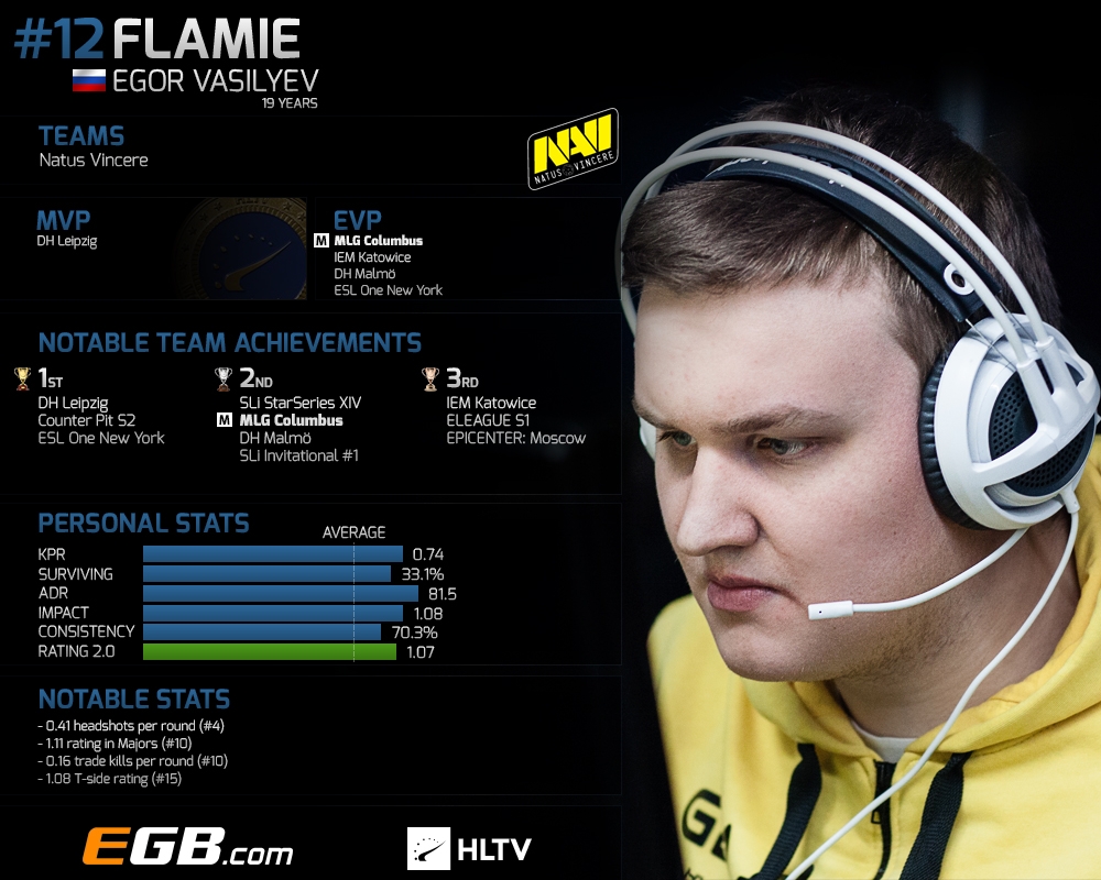 flamie在2016年初时的表现毫无疑问的让他蝉联了第二年的20大选手,给与队伍的贡献更是让他从14名上升到了12名,16年年仅19岁的他以如此稳健的状态帮助队伍在世界的舞台上一步一步走向巅峰无疑是最好的证明之一,全年几乎所有大赛1.0以上的Rating更是锦上添花,不得不说除了震中杯时flamie的发挥有些失常,其余比赛他均是队中最为重要的火力点之一,12名之位实至名归。