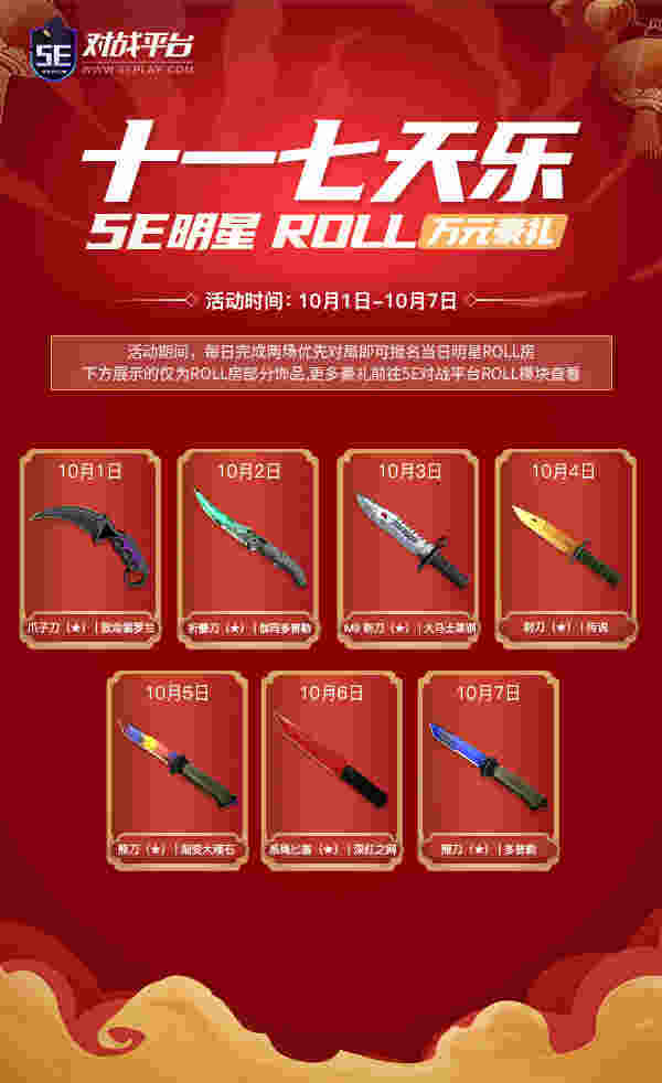 10月1日-10月7日,每日完成两场优先匹配对局(优先组排或者5EPL-D),即可报名当日明星ROLL房。ROLL房将于次日22:00开奖。