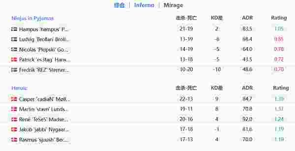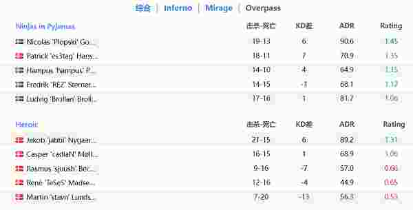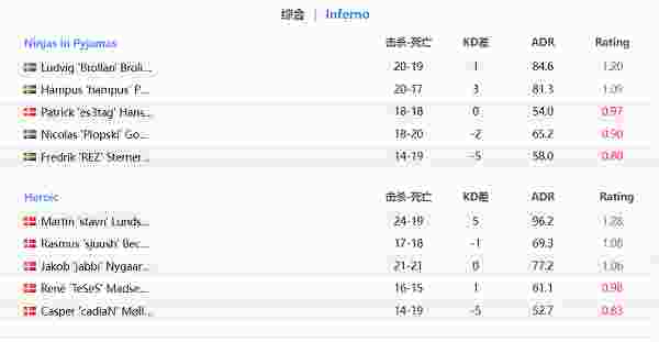 攻守转换,Heroic手枪局进攻A区,jabbi枪法发挥,一个精彩的Ace成功拿下手枪局。拿下手枪局的Heroic连拿3分,比分来到7-11。关键局车头的Rez站了出来,顶住了A区的进攻。随后NiP一鼓作气,16-7拿下本场比赛。