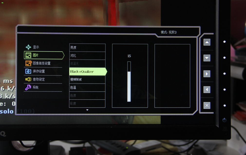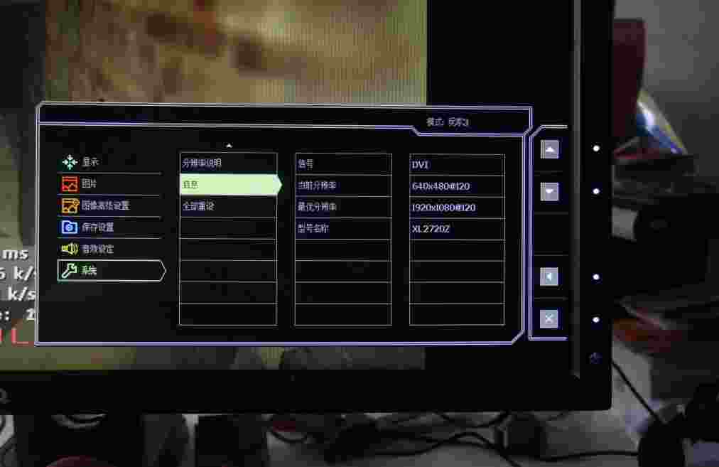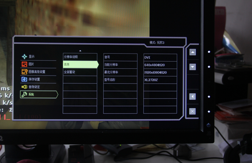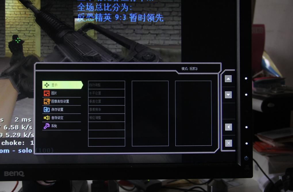 8. 游戏切换更加人性化,之前第一代“电劲王”显示器在从Windows系统桌面切回游戏,总是会弹出显示器中“建议你使用1920×1080分辨率”的提示,这个提示直接把CS游戏画面中的准星遮挡住,严重影响了比赛。现在,明基把这个画面设计在屏幕的侧面,可以看出厂商充分的听取了玩家们的意见进行了改进,这一点很少有厂商能够做到。