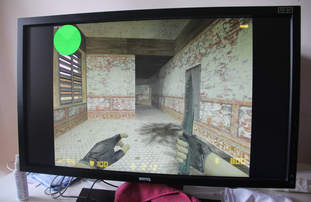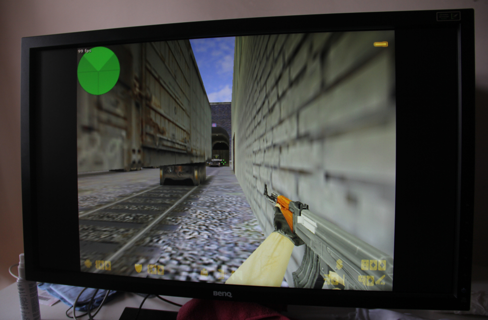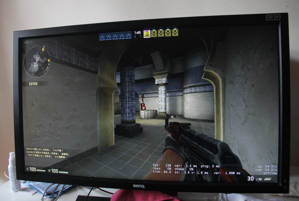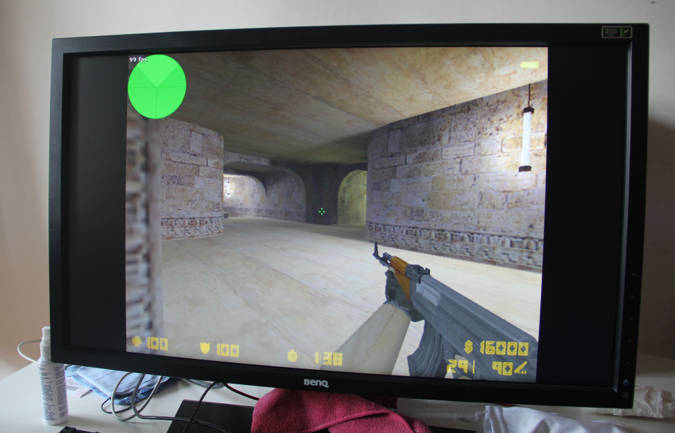 由于明基XL2720Z显示器特别为玩家提供了FPS模式,因此在CS1.6和CSGO两大FPS游戏中我使用了FPS模式,在CS1.6游戏中我将游戏刷新率设置为144Hz,游戏分辨率为640x480。广大CS玩家都知道在CS1.6游戏中普通液晶显示器60Hz或是75Hz的刷新率并不能将游戏画面中的细节之处表现的淋漓尽致,而144Hz刷新率让画面变得更加连续,不会出现明显的断裂感。同时明基XL2720Z显示器还拥有1ms的快速响应速度,在游戏中遇到闪光弹的时候在恢复原状要比普通液晶显示器更快一些。而这一点在CS1.6游戏中更为明显,因此CSGO游戏本身的画质要远远强于CS1.6因此我个人感觉CSGO在144Hz刷新率时画面清晰度并没有CS1.6那么明显。不过明基XL2720Z显示器设计了暗部平衡模式对于FPS游戏是个非常重要的设计,我们都知道在CS游戏中经常会遇到很多黑暗或者是视线效果不好的地方,有了这个功能玩家再也不用担心这些比较郁闷的状况。