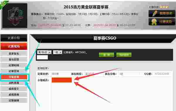 5.报名成功后,可点击左侧比赛现场列表中的分组查询可看到自己的比赛编号(如我的报名编号为6747),进比赛群后请注意改群名片为HFCSGO_6747(数字部分为系统分配报名编号)。
