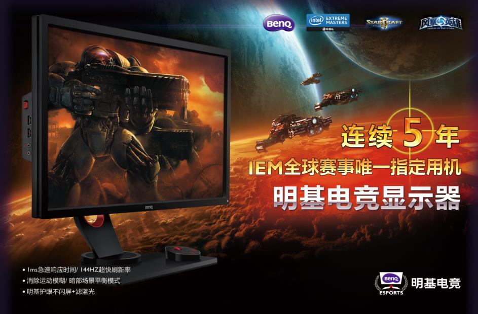 在本届IEM10大师赛中,来自全球各地的电竞高手统一使用由明基BenQ提供的27英寸旗舰电竞显示器XL2730Z,它代表了当今专业电竞显示设备的最高水准,除具备超大荧幕尺寸与2K级QHD超高清分辨率以外,同时还提供144Hz顶级游戏刷新率,与快达1ms的GTG响应时间,再加上首度搭载AMD free-sync技术,并结合明基特有运动模糊消除技术,将游戏卡顿或画面延迟现象彻底一扫而空,继而最大限度符合高水平电竞对抗所需。