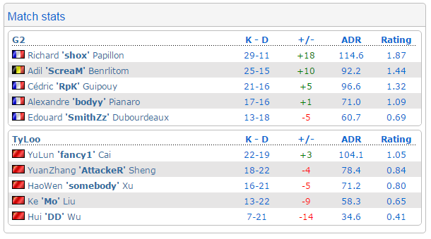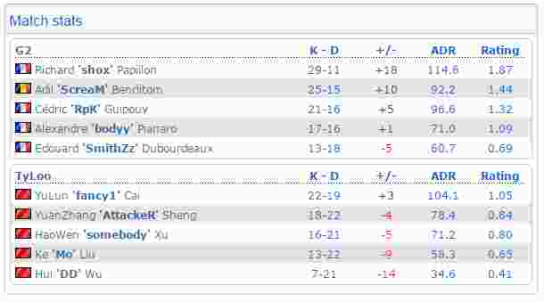 下半场手枪局,TyLoo采取3人走蓝门2个人走A厅进攻A区的战术,被镇守A区的ScreaM刷了4个人头,第二局强起也没有收到很好的效果。但是TyLoo在下半场第三局并没有选择eco而是再次强起,G2的队员猝不及防A区被刷掉3个人头瞬间失守,TyLoo完成翻盘。遗憾的是在接下来的几局比赛中天禄没有拿出我们熟悉的“城管战术”,老道的G2显然赛前对天禄进行了研究,RPK在B区依靠个人能力以及玄学烟雾弹多次完成多杀,天禄甚至没有占领包点下包的机会,进攻中的失误也越来越多,最终以9-16的比分输掉了这次major预选赛的首场比赛。