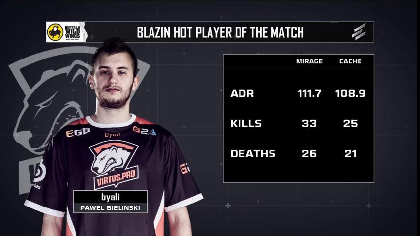 各自取得两场比赛胜利的VP和EnVyUs在当天最后一轮比赛中对话,VP在第一场mirage上的比赛有着不错的状态,总是能在EnVyUs连续得分时将对手的攻势遏制住,但是他们在手握两个赛点的情况下被法国人将比赛拖进加时,好在VP在加时赛中利用先做CT的优势取得了比赛的胜利。