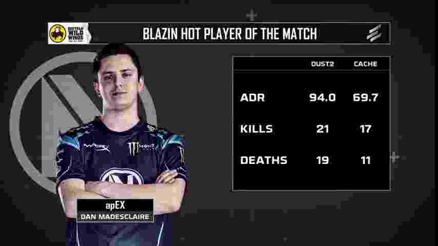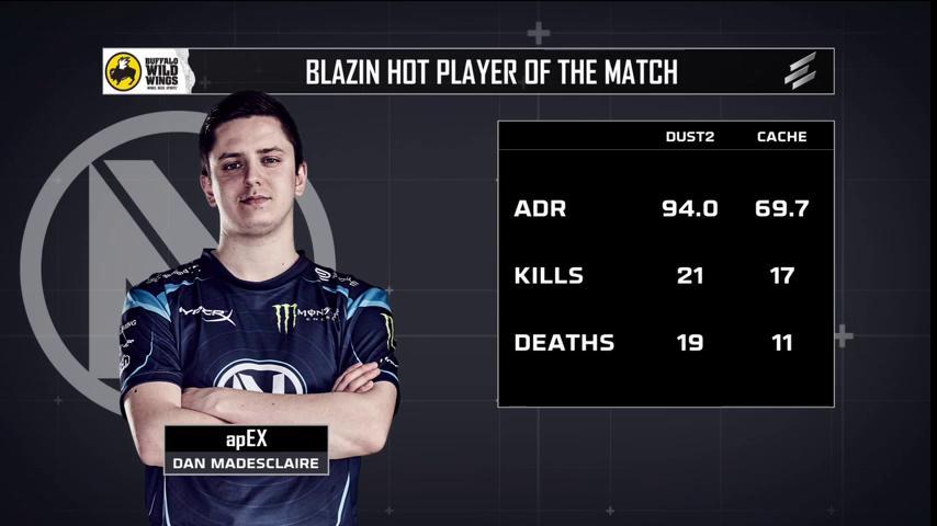 EnVyUs和col的比赛中,KennyS继昨天之后再次展现出了良好的状态,拿到了全场最高的frag。但是法国队的其他队员也逐渐找到了好状态,happy在他的断后和骚扰的位置上的工作完成得非常出色,他的优秀发挥确保了dust2上的大胜,而队内突破手APEX的发挥也十分出色,赛后他也获得了全场最佳的称号。