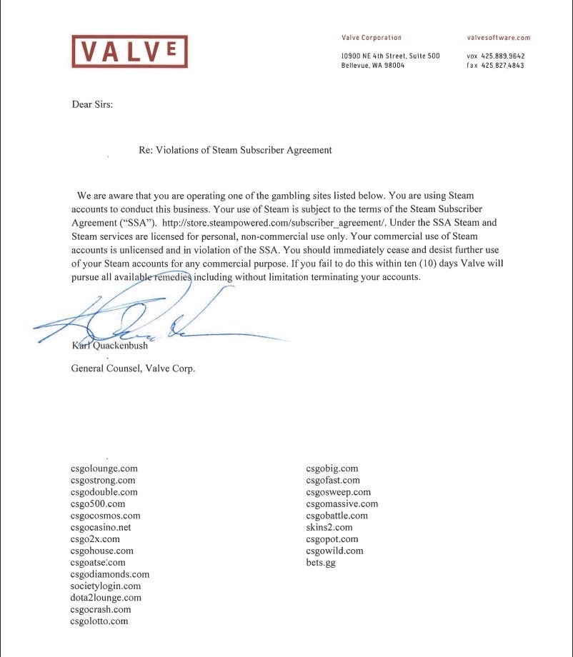 有国外博彩网站于北京时间7月20日晚间发布消息,确认收到了由Valve法律顾问发出的关于终止赌博网站运营的通知。
