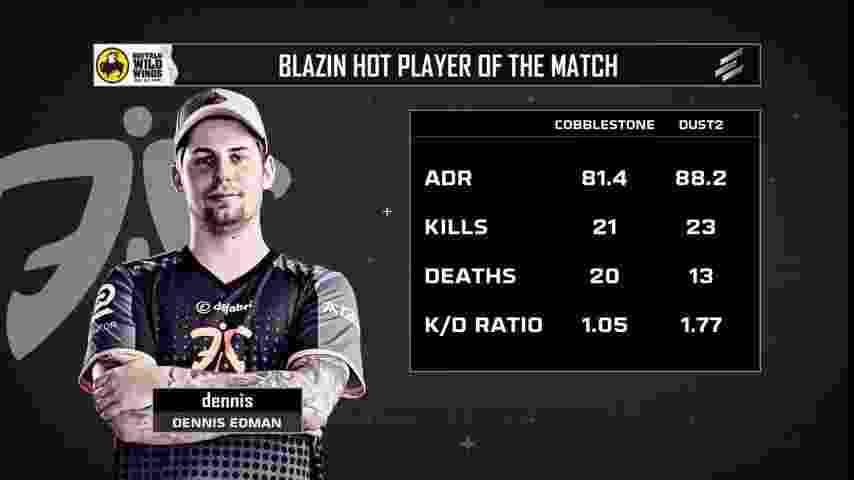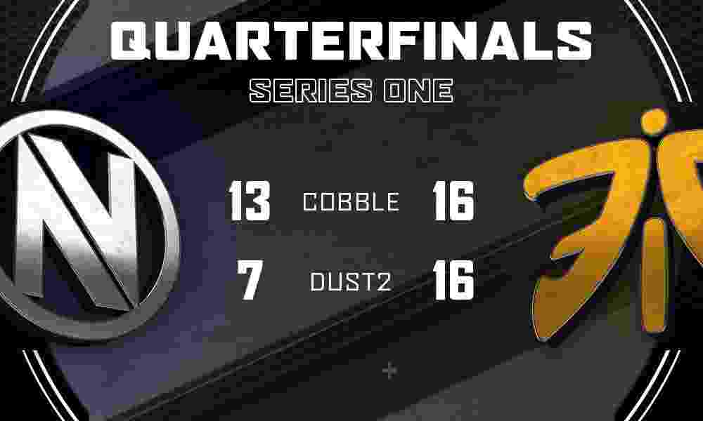 fnatic在1/4决赛中面对法国人EnVyUs,双方首场比赛在cobblestone上进行,fnatic上半场取得了大比分领先,虽然nV在下半场追回了许多分数,但是fnatic在最后的关键局发挥的更加出色赢下第一场比赛。