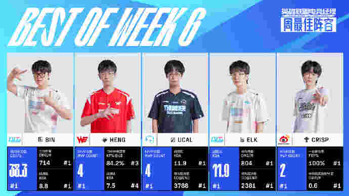 北京时间7月10日,英雄联盟赛事官方公布了LPL第六周的最佳阵容,BLG双C:Bin、Elk领衔,并且BLG战队已经身穿季后赛复活甲,Ucal带领TT打出三连胜,输出拉满!野辅则是WE新人Heng和冠军辅助Crisp分别上榜!
