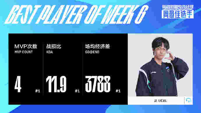Ucal最近状态非常不错,是队伍的输出核心,最近5场比赛狂砍37个击杀!并且带领队伍豪取三连胜!成为本周MVP实至名归!