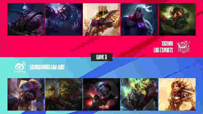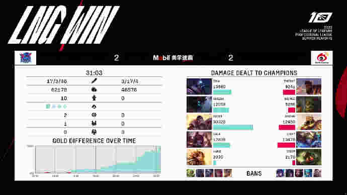 比赛最后一波,第42分钟,LNG卡住TheShy奎桑提复活时间直接拍远古龙,WBG不得不接但是双复活甲直接被打出!Crisp曙光想控后排但是Tarzan大树抢下远古龙之后局势已不可逆转!随着GALA维鲁斯收下了三杀!LNG打出1换5团灭WBG,扳平比分!