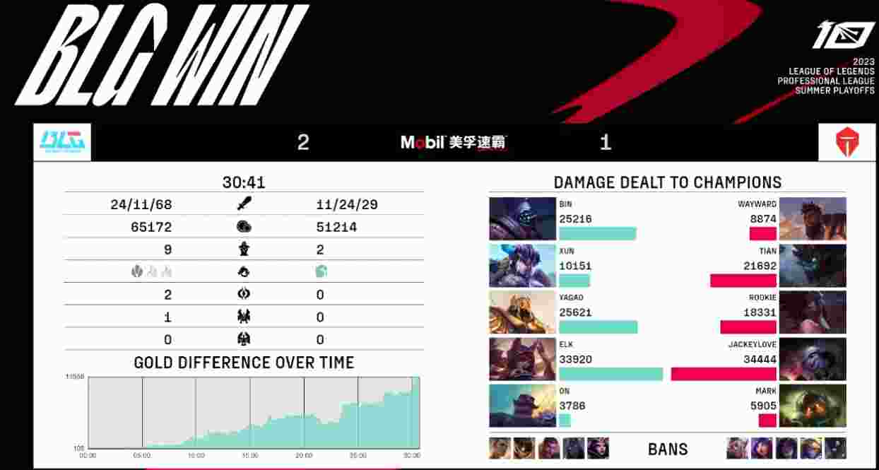 27分钟BLG击杀Rookie阿卡丽后拆掉TES中路水晶,30分钟BLG打出零换五,顺势一波推平基地,拿到赛点!