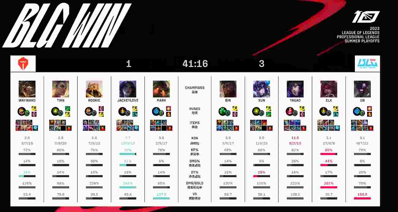 20分钟双方在河道交火,Rookie阿卡丽进场输出拉满,TES打出一换三。23分钟双方继续开战,BLG打出零换四后稳稳拿下大龙!