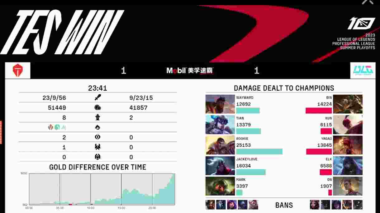 19分钟TES在野区抓死牛头,22分钟中路爆发大规模团战,JackeyLove输出拉满,TES打出二换四。随后TES开打大龙,Yagao阿狸前来骚扰,Rookie阵亡后TES撤退。