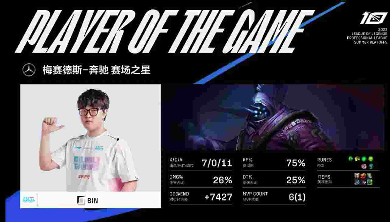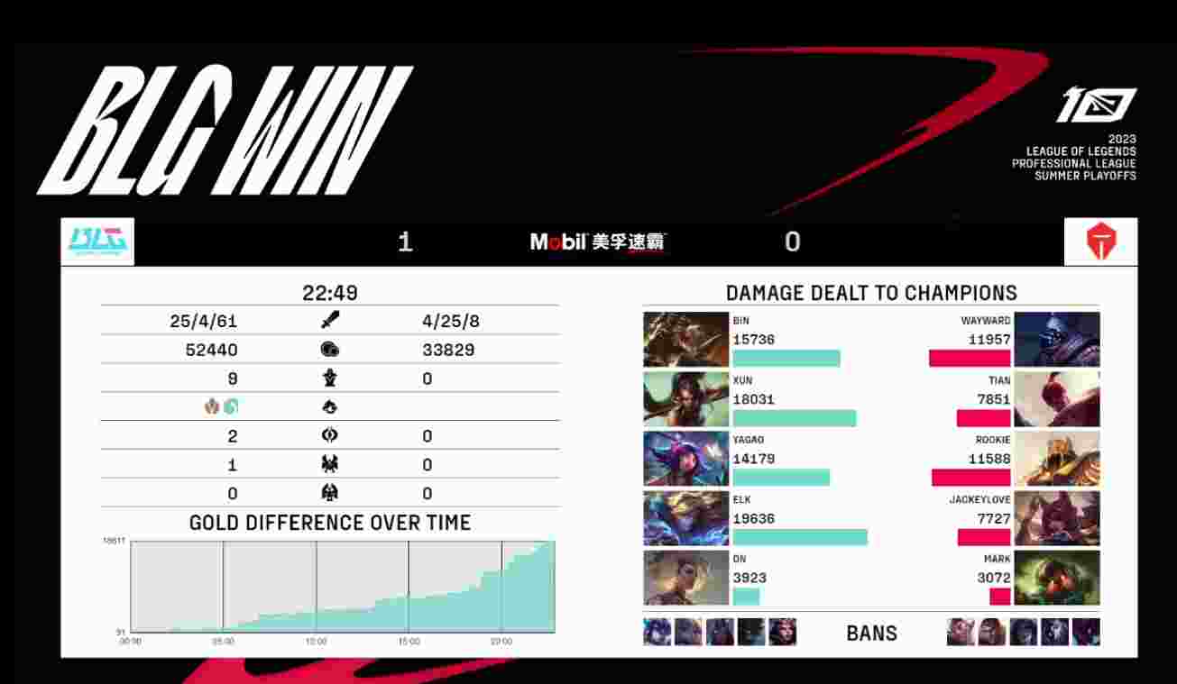 40分钟双方开战,牛头巧妙顶回Rookie沙皇,Elk霞力挽狂澜拿下五杀,BLG顺势一波推平基地,拿下最后的胜利!