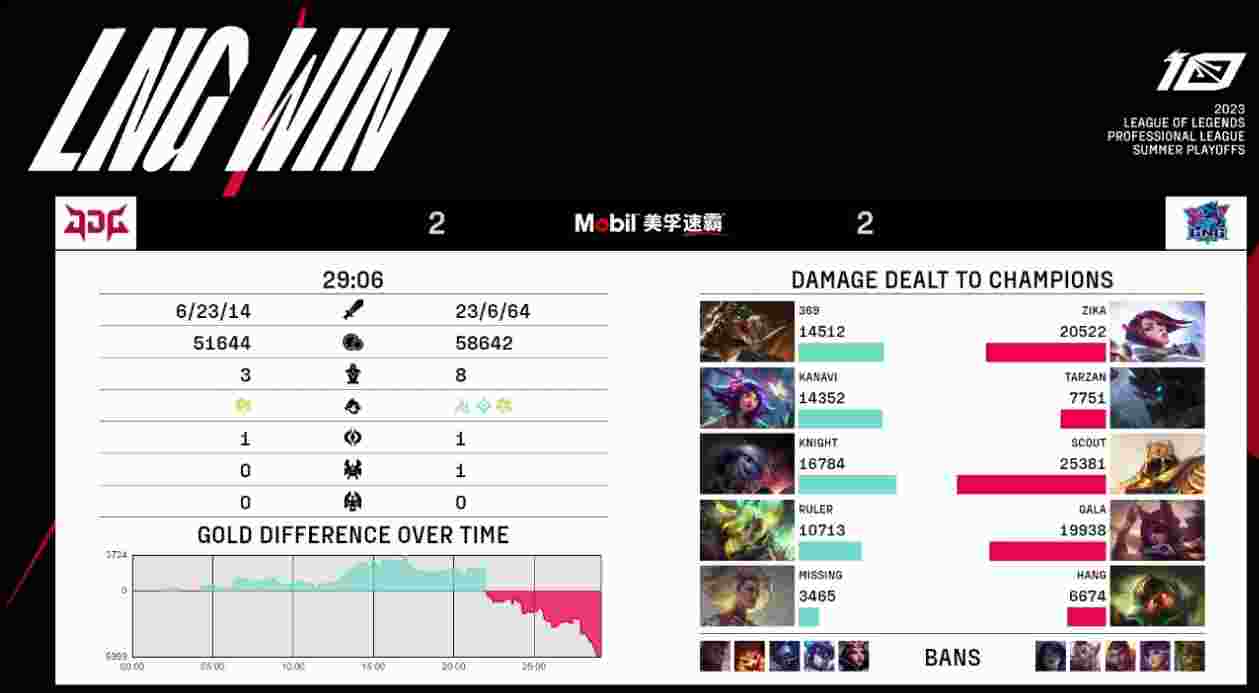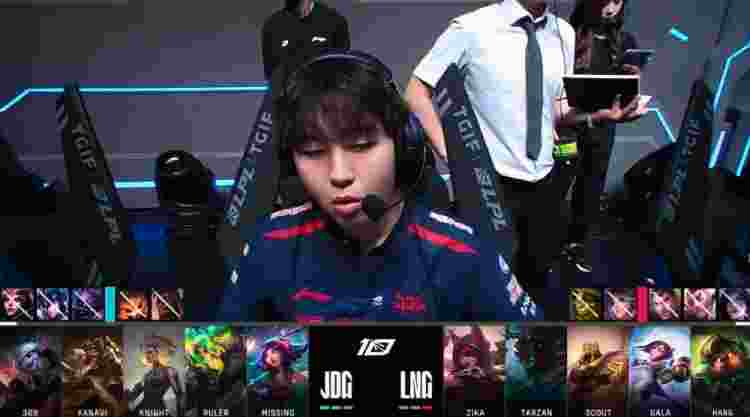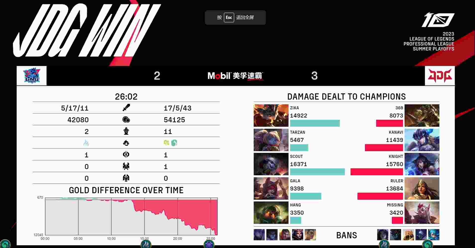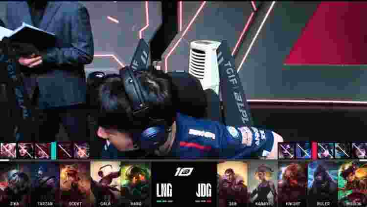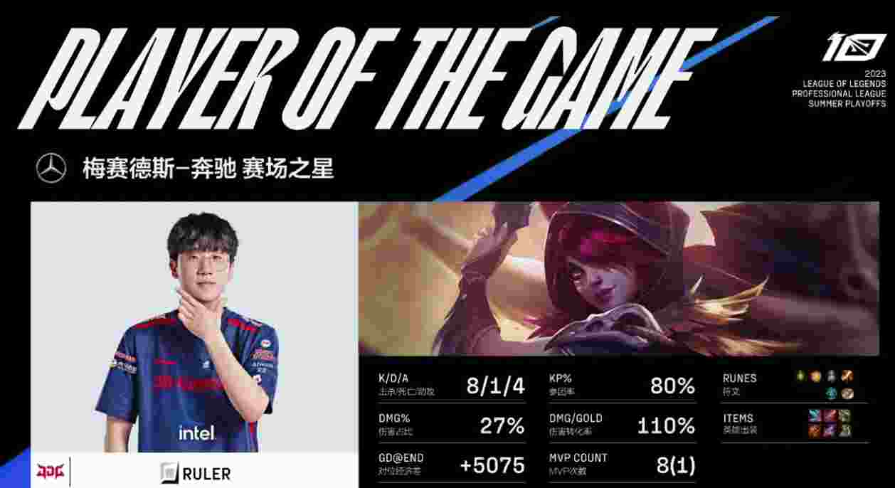 26分钟JDG再次登上LNG高地,Ruler厄斐琉斯收获五杀,JDG一波推平,拿到赛点!