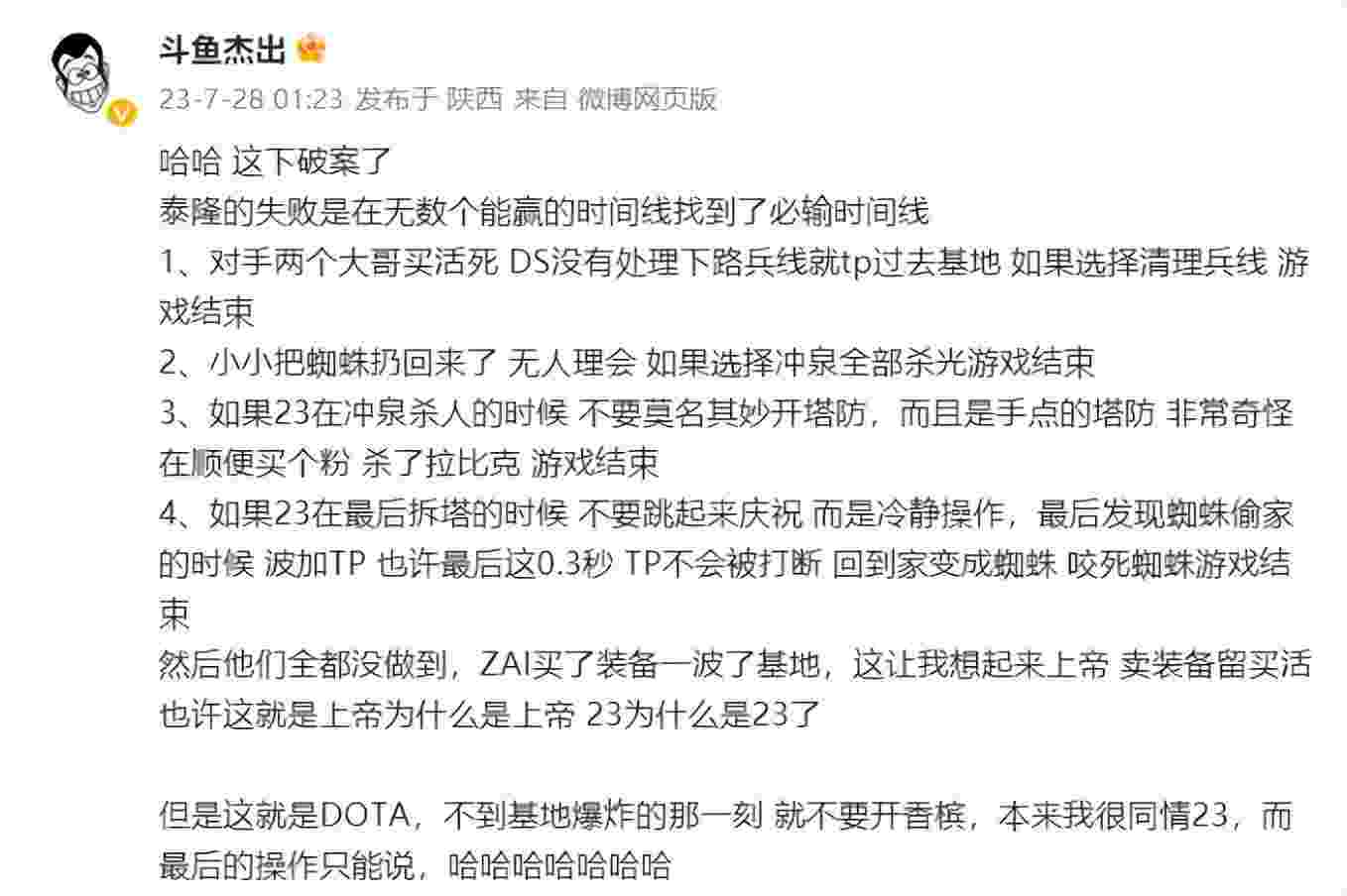 但在发现zai的蜘蛛灵性偷家后,23savage甚至慌张到站着操作游戏,可惜塔防被提前开启,自己的TP又被断,Talon无力回天。蜘蛛完成了史诗般偷家!Talon也掉入了败者组。