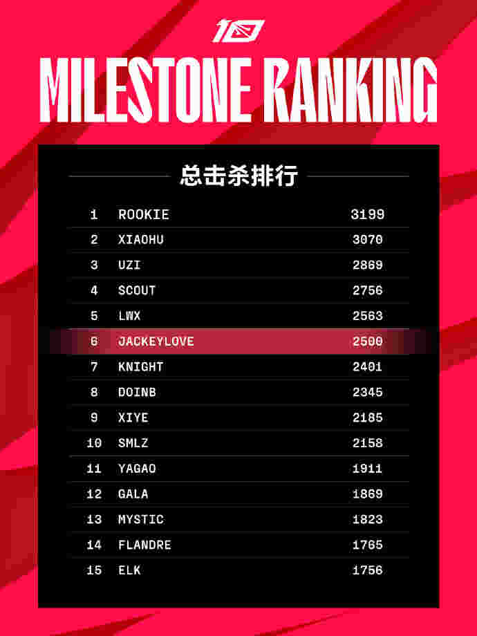 目前JackeyLove在LPL击杀榜单上排名第6,在他前面的有Rookie、Xiaohu、Uzi等明星选手,期待JackeyLove解锁更多的里程碑数据!
