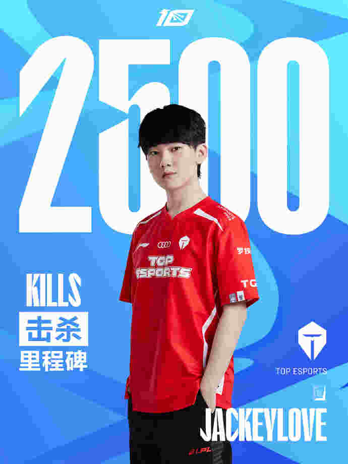 北京时间7月29日,在今日TES对阵LNG的比赛中,TES的下路选手JackeyLove使用韦鲁斯达成了在LPL的第2500杀,是LPL第6位达成该成就的选手,恭喜JackeyLove!