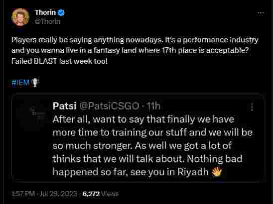“现在选手真是什么都敢说。这是一个“表现为王”行业,而你却活在梦里,你还觉得第17名是可以接受的?上周的 BLAST 你们也失败了好吧?!”