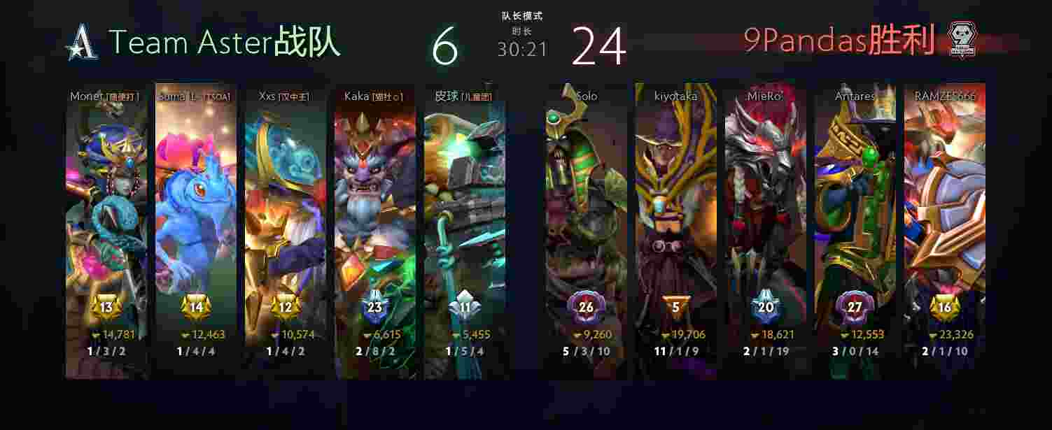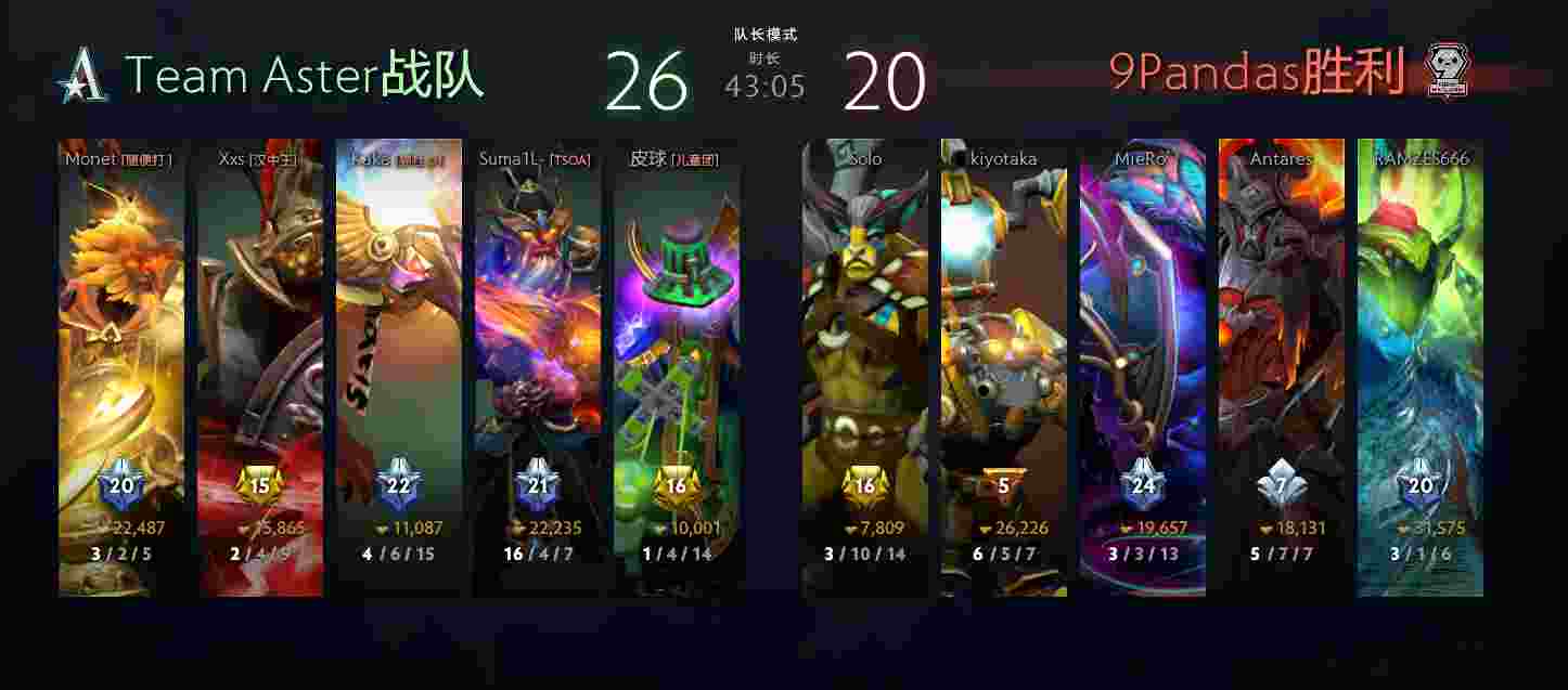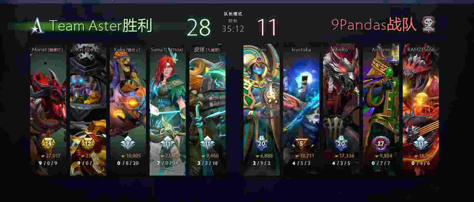 先说对线这场Aster其实对线期打的还是十分不错的,首先三路都是平稳的发育到了6分多钟,Aster也是明白9Pandas本场的关键就是这个TK,开始双酱油包围中路,配合TC对点的火猫数次击杀TK。Xxs的马尔斯第一件装备十分灵性的选择陨星锤,可以在前期快速的推掉9Pandas的外塔,TK在12级之前只能够飞防御塔,如果外塔很早的全掉TK是很难刷起来的。Aster在前期的节奏其实是非常不错的,针对TK也是十分有效果TK在15分钟甚至都只有8级几乎是已经无法刷起来的情况,Aster只要在推掉9Pandas的下路两个塔TK就已经无处可去了。但这时候Aster的进攻突然停止,开始刷钱打盾,这也确实没有问题,但在21分钟拿到Roshan盾之后,5分钟的时间内Aster也是完全没有进攻下路防御塔的想法。这时其实经济已经不对了,很多人只注意TK,却没有注意水人已经快刷到经济第一的位置了,都觉得TK后期强势,难度水人打Aster这个阵容就不无敌吗?来到32分钟TK出到虚灵刀水人出到冰眼蝴蝶,就算Aster带着第二代Roshan的盾加奶9Pandas团战也是完全不虚,一波团战直接将Aster打入地狱,Kiyotaka的TK在泉水击杀马尔斯加凤凰Aster已经可以敲出GG。