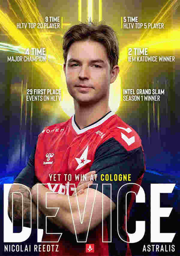 Heroic之间的丹麦德比。赛前,IEM官方在推特发布海报致敬device:连续8年荣登HLTV TOP20选手榜单、6次TOP5、职业生涯获得过30座(海报数据关于TOP次数及奖杯数有误)冠军奖杯、4次Major冠军、2次卡托维兹登顶、1次英特尔大满贯,唯一欠缺的就是科隆登顶。