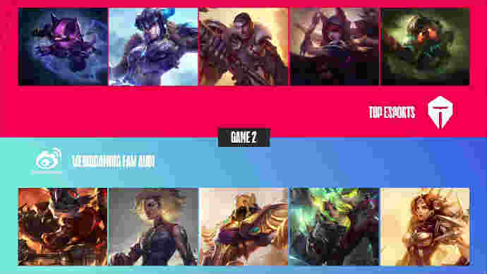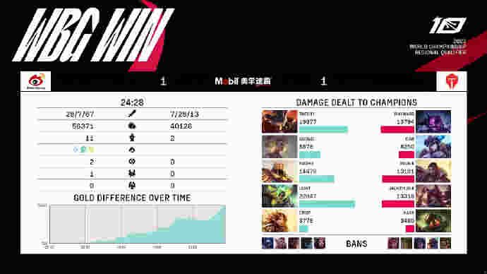 22分钟,洛野区被抓,霞拿到人头,小龙刷新,TES去开小龙,WBG三人过来接团,泽丽抢掉小龙但被沙皇击杀,小炮中路带掉TES水晶,野区格温与猪妹2V4,格温单杀米利欧再杀霞拿到双杀,沙皇终结格温,双方打出2换2,WBG经济优势来到9K。