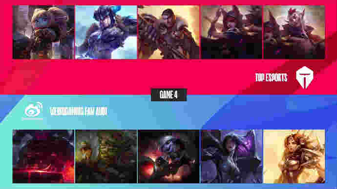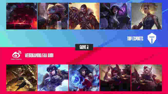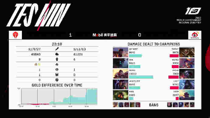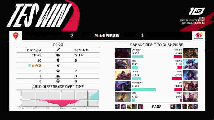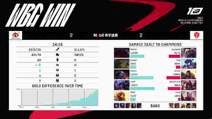 22分钟,WBG中路推进拔掉TES二塔,猪妹顶在前面抗住伤害,奥恩羊来羊走,卡莎击杀猪妹,WBG冲上TES高地,洛残血被小炮收掉,WBG打出0换2一波推平TES基地将其零封,双方进决胜局。