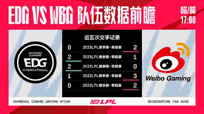 从近五次的交手情况来看,双方互有胜负,但是WBG赢下了其中的三次,并且在最近的一场比赛,也就是今年的夏季赛常规赛中,WBG零封了EDG,所以从历史数据来看,WBG是更占优势的一方。