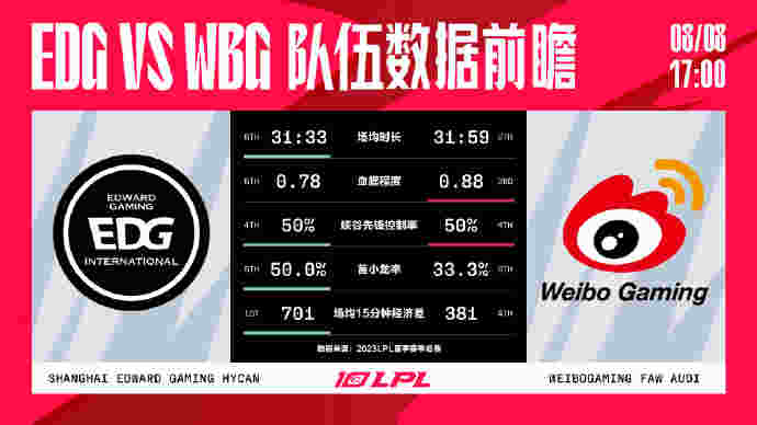 两边都是比较喜欢后期团战解决比赛的队伍,所以时长方面都是31分钟出头。但是在相似的用时里,WBG更加的喜欢去打架,通过选手的个人实力发挥为队伍创造更多的优势,而EDG的情况相信经常看比赛的观众也清楚,他们是LPL里最擅长运营的队伍,所以血腥程度方面较低。剩下的首小龙率、场均15分钟经济差则是EDG更占优势,峡谷先锋控制率都是50%,总体来说双方实力都不错,本次交手应该会十分精彩!