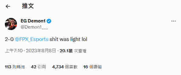 今日无畏契约全球冠军赛上,B组中国战队FPX首战0-2不敌北美的EG战队。值得一提的是,EG选手Demon1不仅在游戏内作出“鞭尸”FPX队员的操作,赛后更是在推特上嘲讽:2-0 FPX赢这些垃圾很轻松。