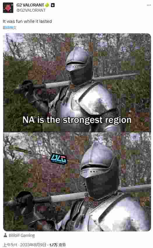 G2官推配上了两张图片,图一是装甲的骑士,扬言北美赛区是世界最强赛区,紧接着一支代表BLG的穿云箭直插骑士面门,意思是在NRG还没反应过来的时候就已经被BLG击败。同时配文:“这真是充满乐子的一天。”