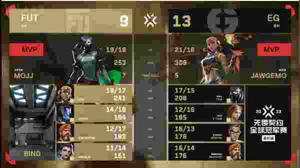 下半场手枪局,eg5人a小冲击a区,但是他们的防守如同烂泥一般顶不住任何冲击,被fut打了个0换5。下半场第二分,eg选择强起,jawgemo化身杀神在小黑屋一波蜂刺压枪接下两人,帮助eg实现经济与比分的反超。第一个长枪局,jawgemo b大混死kaptan并在浴室开启晚安焰火再收一人,纵使mrfalin拿下1v2残局也无法挽救队伍丢分的颓势。对手eco分,demon1浴室单发连击3个响亮的头盖骨成功奏出eg拿下第十分的精彩乐章。c0m接下队友的接力棒,以一个1v2残局成功将比分拉开到11:7。第十九回合,a点的fut队员通过黑梦的终极技能逼eg转向b点,最终eg2v4失败,比分缩小至11:8。第21分,eg再次凭借连续的lineup与拉扯围绕爆能器成功拿下半起局,比赛来到赛点!赛点局,eg全员发挥以摧枯拉朽之势推进b点最终2-0打败fut!