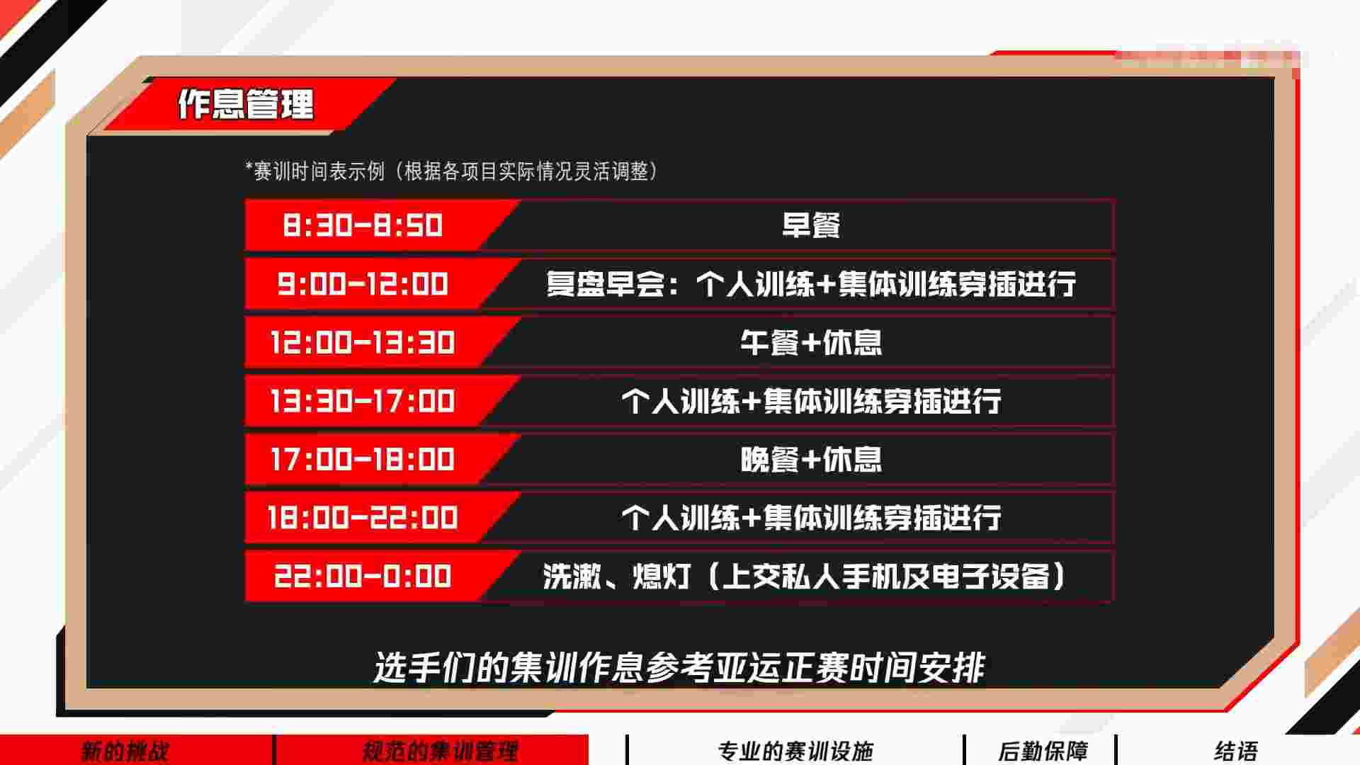 早上8点30起床早餐,晚上12点之前就要熄灯睡觉还得上交私人手机及电子设备,这作息几乎是和现役职业选手的作息反着来的,不知道亚运会的选手们多久能适应这样的生活习惯
