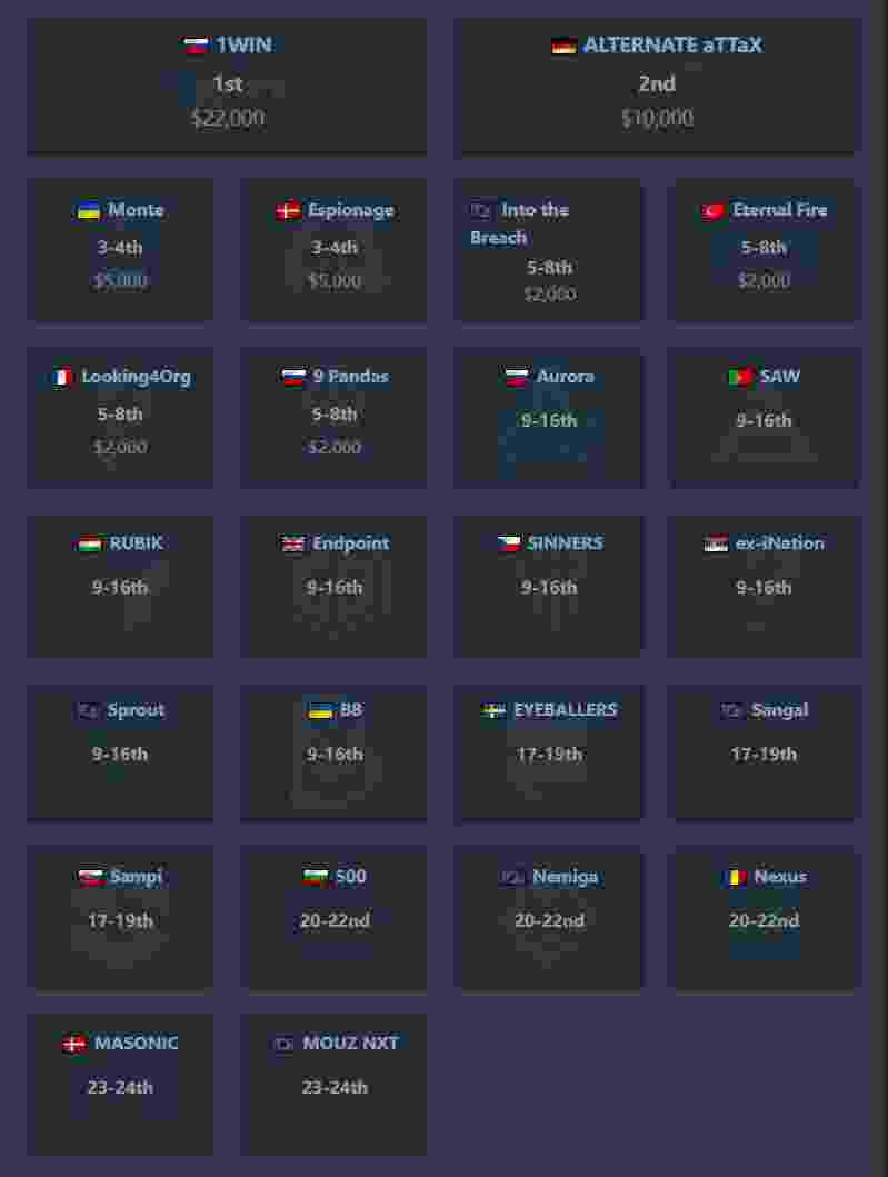 夺冠的1WIN战队收获了22000美元的冠军奖金。本次赛事中不乏有Monte、ITB等知名战队参赛。其中Monte战队止步四强,而ITB则止步八强。