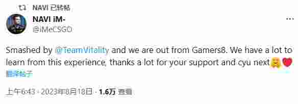 “被Vitality击败,我们离开了Gamers8的舞台。这段经历让我们学到了很多,感谢大家对我们的支持,下次见。”