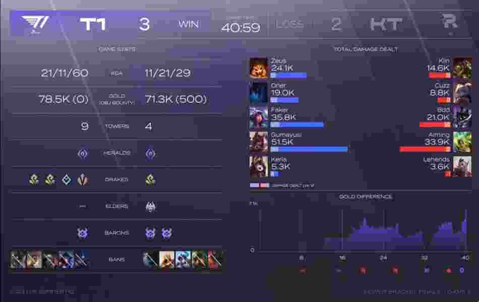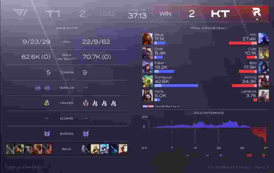 第7分钟,波比来到中路gank逼出尼蔻闪现,但梦魇及时赶到配合尼蔻击杀波比后成功撤退。第9分钟双方爆发先锋团战,梦魇率先阵亡,KT也拿下了先锋。第12分钟双方爆发小龙团战,波比率先开团,T1轻松反开,打出一波0换3拿下小龙。第20分钟双方爆发小龙团战,KT拼死拿下小龙。但中上被击杀,随后T1选择打大龙,但波比闪现下龙坑抢到大龙。第27分钟,T1在中路开到鳄鱼成功击杀,紧接着转打大龙,但小法师闪现下龙坑抢下了大龙。第32分钟,双方爆发小龙团战,T1率先拿下龙魂,但后续T1团战被打出2换4。第33分钟,KTrush大龙,但梦魇开大飞进龙坑抢到大龙后成功撤退。第38分钟,双方爆发远古龙团战,波比抢下大龙,KT打出3换4,但中路推进过程中霞击杀波比守住了基地。第40分钟,T1大龙逼团,尼蔻开到两人,梦魇,纳尔进场跟上伤害秒杀泽丽,T1打出一波1换3中路一波结束了比赛。