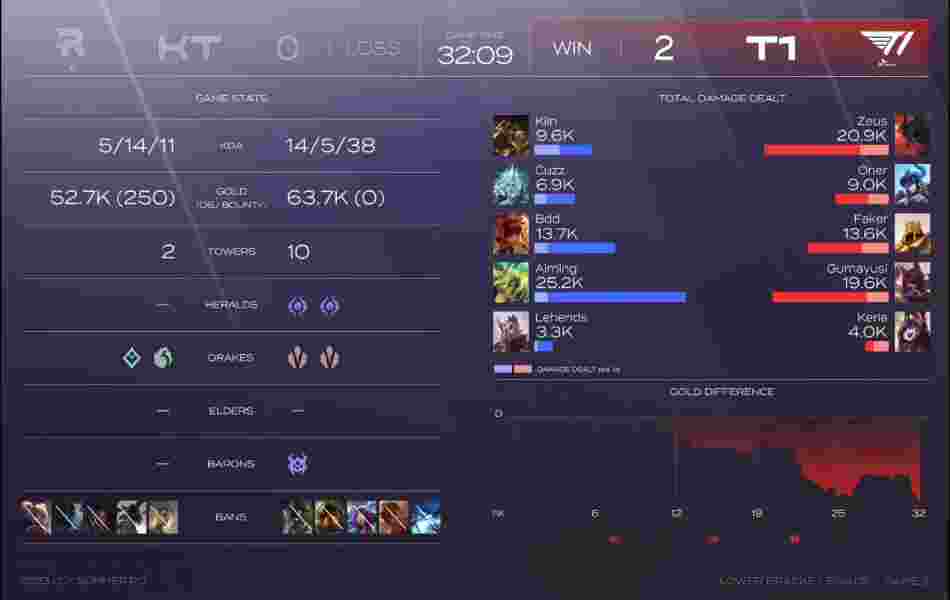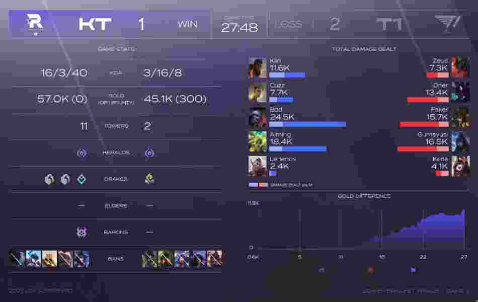 第5分钟,KT中野抓下,T1选择3打2,第一时间击杀芮尔,洛也被追击击杀,但泽丽过于上头也被霞收下人头。第12分钟,波比绕后被发现,KT四人集结追击成功击杀波比,但T1也趁机拿下了先锋。第15分钟,尼蔻中路大招闪现进场打中3人,T1众人跟上输出成功击杀两人。第17分钟,尼蔻上路进场想要击杀瑞兹,但KT众人及时赶到成功打出一波0换4。第22分钟半,双方爆发大龙团战,洛率先阵亡,尼蔻在侧面拖住KT四人,T1成功拿下大龙。第28分钟,双方爆发小龙团战,尼蔻进场开到三人,但芮尔精彩反开也牵制住了T1众人,最终KT打出一波2换3拿下小龙。第32分钟,双方爆发大龙团战,芮尔抢下大龙。KT团战成功打出一波2换5。第36分钟,尼蔻中路开团失败被秒,KT顺势反开团灭T1中路一波结束了比赛。+