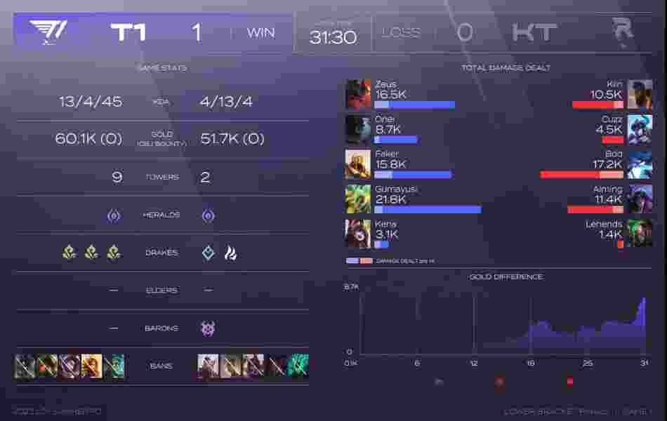 第3分半,猪妹来到下路gank,配合队友完美comb成功越塔击杀洛,TP赶来的安妮也毫无收获。第9分钟,猪妹来到上路gank,上野完美comb成功击杀鳄鱼。第10分钟,KT野辅gank中路,沙皇极限逃生拖住KT中辅,最后安妮收下人头。第12分钟,T1野辅游上再次完成对鳄鱼的击杀。第13分半,沙皇在中路流沙移行推掉泽丽配合队友完成击杀。第19分钟,双方爆发小龙团战,T1率先拿到小龙,KT选择集火击杀剑魔作为交换。第22分钟,KT在上路河道选择开沙皇,沙皇精彩走位完成逃生,赶来的T1众人面对没有技能的KT成功打出0换5,顺势拿下大龙。第27分钟,KT在下路高地开到霞,直接打出霞大招,赶来的剑魔也扛不住伤害,上下二人双双送出人头。第29分钟,KT众人上路gank剑魔失败,T1其余英雄轻松推掉中路高地塔。第31分钟,双方爆发大龙团战,T1凭借经济优势轻松打出0换4一波结束了比赛。