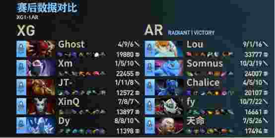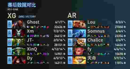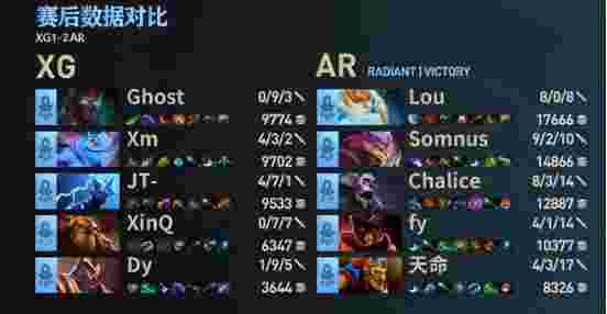 第一局AR阵容却空面对XG三位移英雄完全打不到人,敌法师装备成型到处乱杀,AR处理不了敌法师女王只能gg。第二局Lou的绝活小娜迦经济领跑边打边刷碾压取胜。第三局XG再次放出了Lou的小娜迦,这次AR三路线优,Chalice的三号位巫医能打能奶,双方战斗力完全不是一个维度,二十三分钟AR冲上高地团灭XG后赢下比赛。