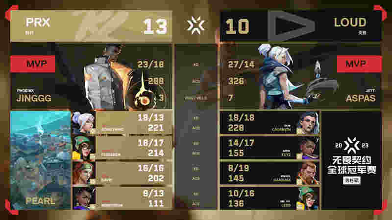 本张地图PRX 13:10 LOUD,MVP给到了Jinggg选手。