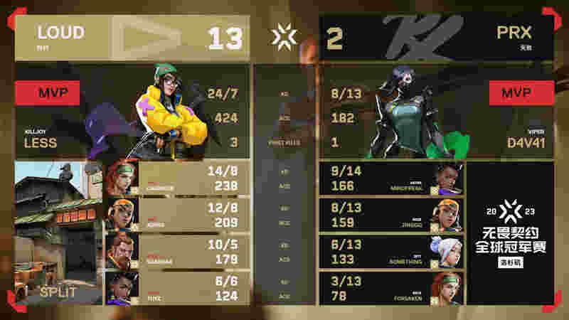 本张地图PRX 2:13 LOUD,MVP给到了Less选手。