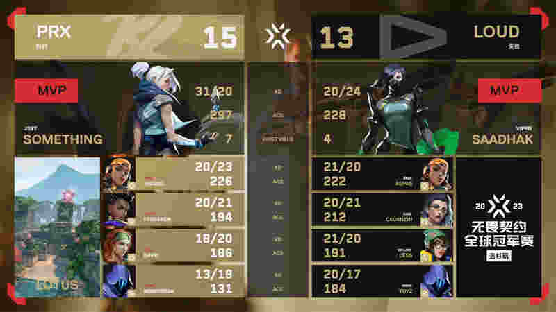 本张地图PRX 15:13 LOUD,MVP给到了something选手。