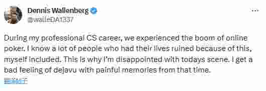 “在我的CS职业生涯时期,有一段时间在线扑克非常流行,许多人因此毁掉了自己的生活,这其中也包括我在内。所以我对当下的一些场景仍然感到失望(walle意指现在的一些比赛和战队都依靠博彩平台的赞助,而其作为过来人,也在告诫年轻人们不要像之前的自己一样),这让我回忆起了那段痛苦的时光,有一种似曾相识的感觉。”