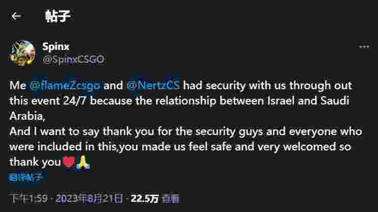 “鉴于以色列和沙特阿拉伯之间的关系,我、flameZ和NertZ在比赛期间都有24/7的安全保护。