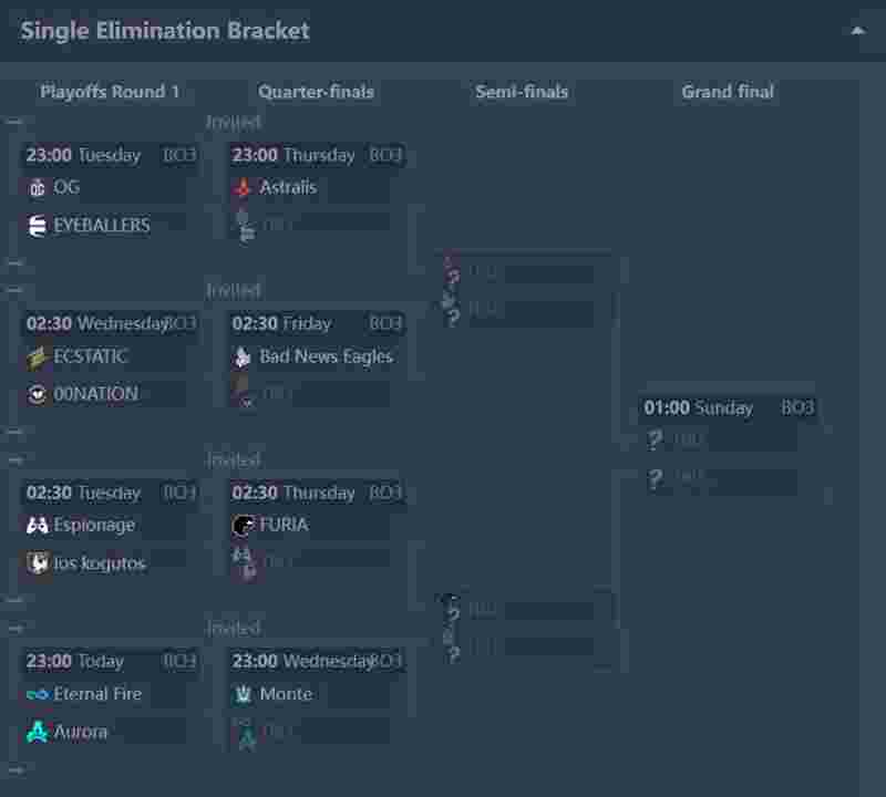Bad News Eagles四支战队受主办方的邀请直接参加淘汰赛阶段,他们将会在1/4决赛中坐等淘汰赛第一轮的获胜战队。