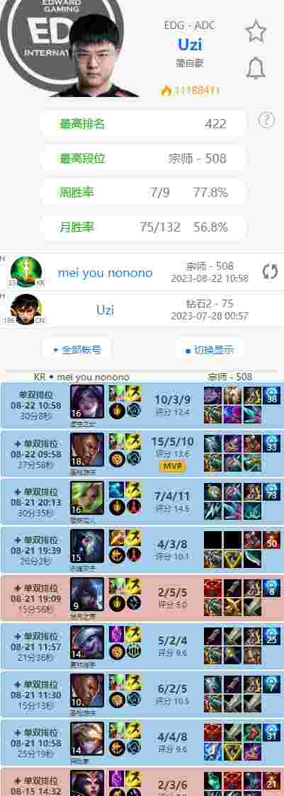 北京时间8月22日,EDG下路选手Uzi昨日开启韩服Rank训练,今早十点左右又开始了韩服的征战,一局卢锡安15-5-10、一局卡莎10-3-9,顺利拿下四连胜,并冲上宗师500分。